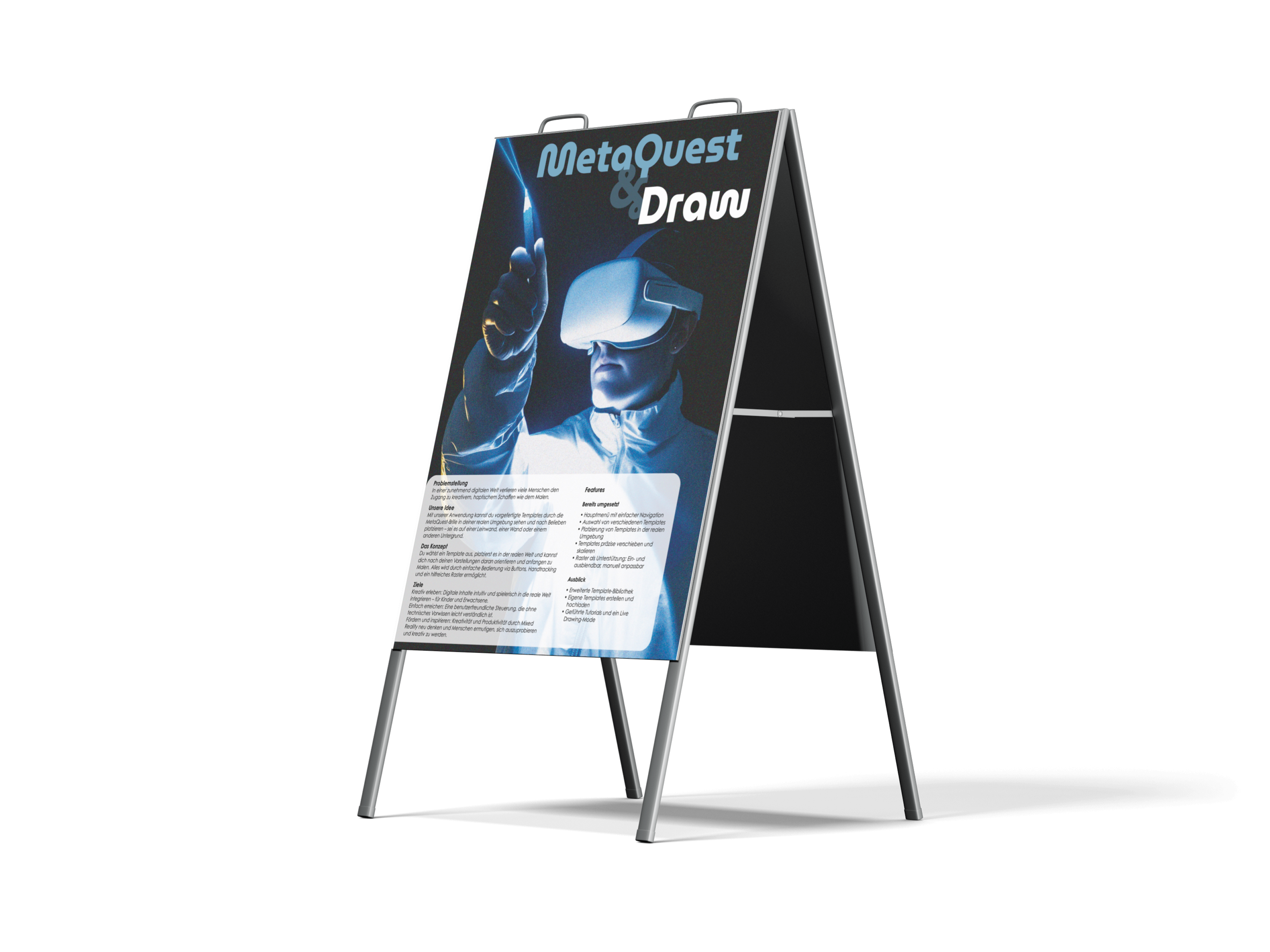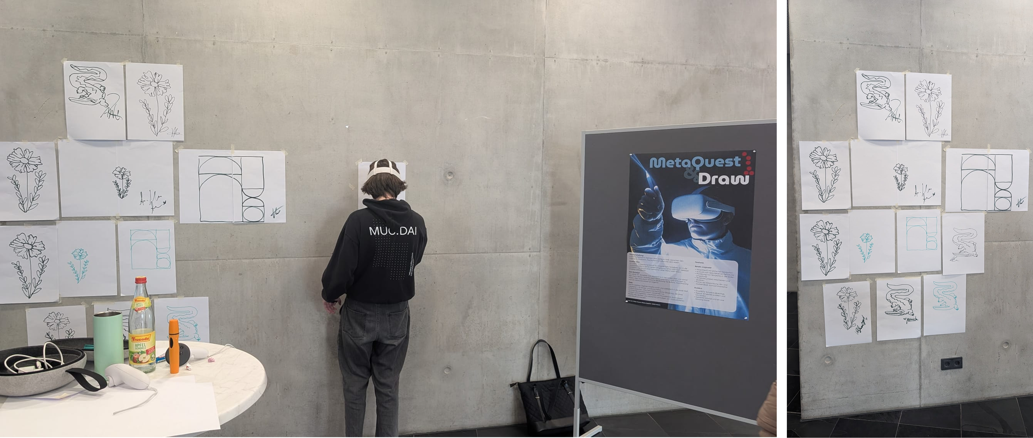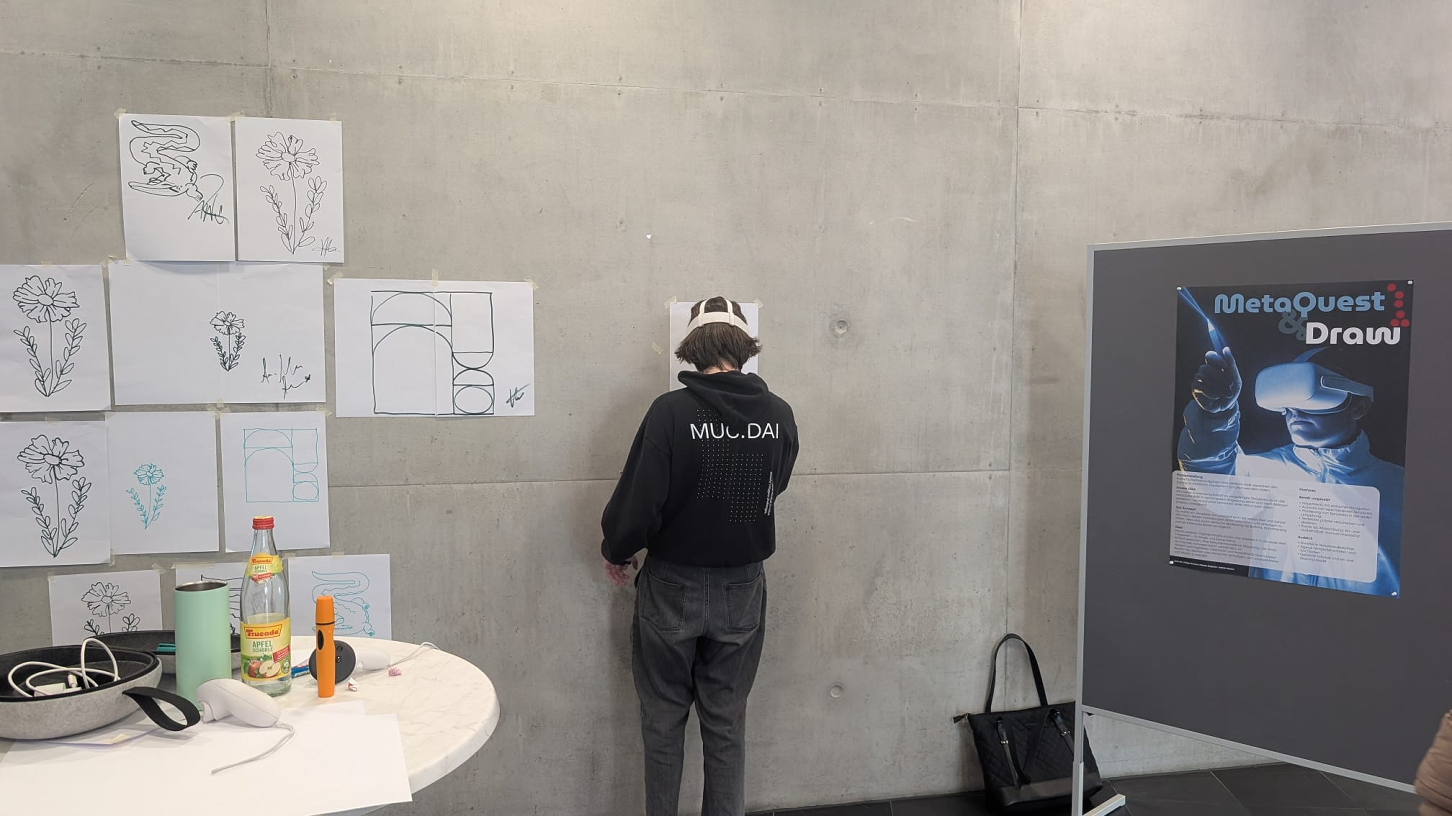 Zum Abschluss des Projekts wurde MetaQuest & Draw im Rahmen einer öffentlichen Ausstellung präsentiert. Hier hatten Besucher:innen die Möglichkeit, die Mixed-Reality-Anwendung selbst auszuprobieren und den kreativen Zeichenprozess mit der Meta Quest 3 live zu erleben. Um das Konzept verständlich zu vermitteln, gestaltete das Team ein begleitendes Informationsplakat, das den Projektverlauf, die Funktionsweise der Anwendung sowie zentrale Designentscheidungen veranschaulichte. Das Poster diente als visueller Leitfaden für Interessierte und half, den technologischen Ansatz hinter der Anwendung leicht zugänglich zu machen.