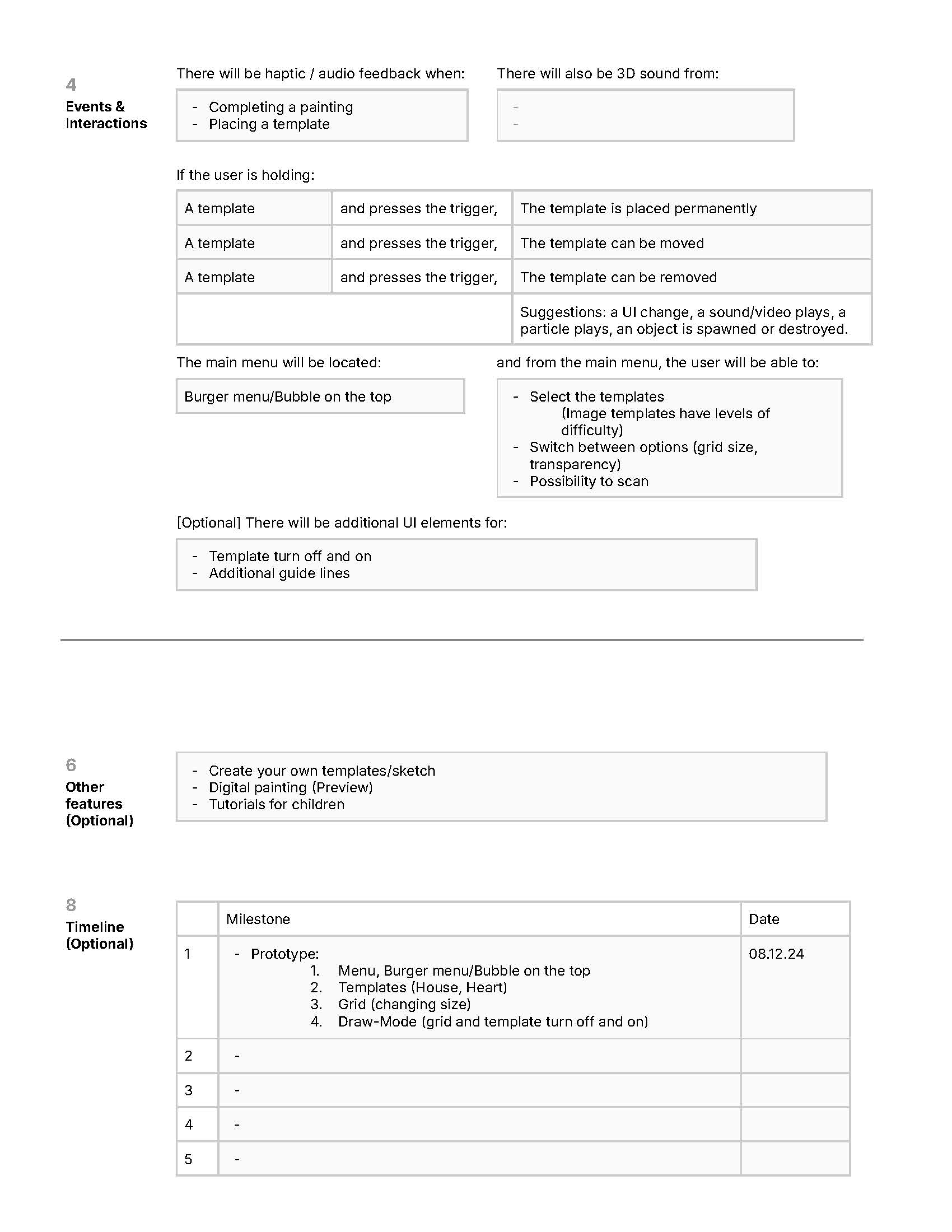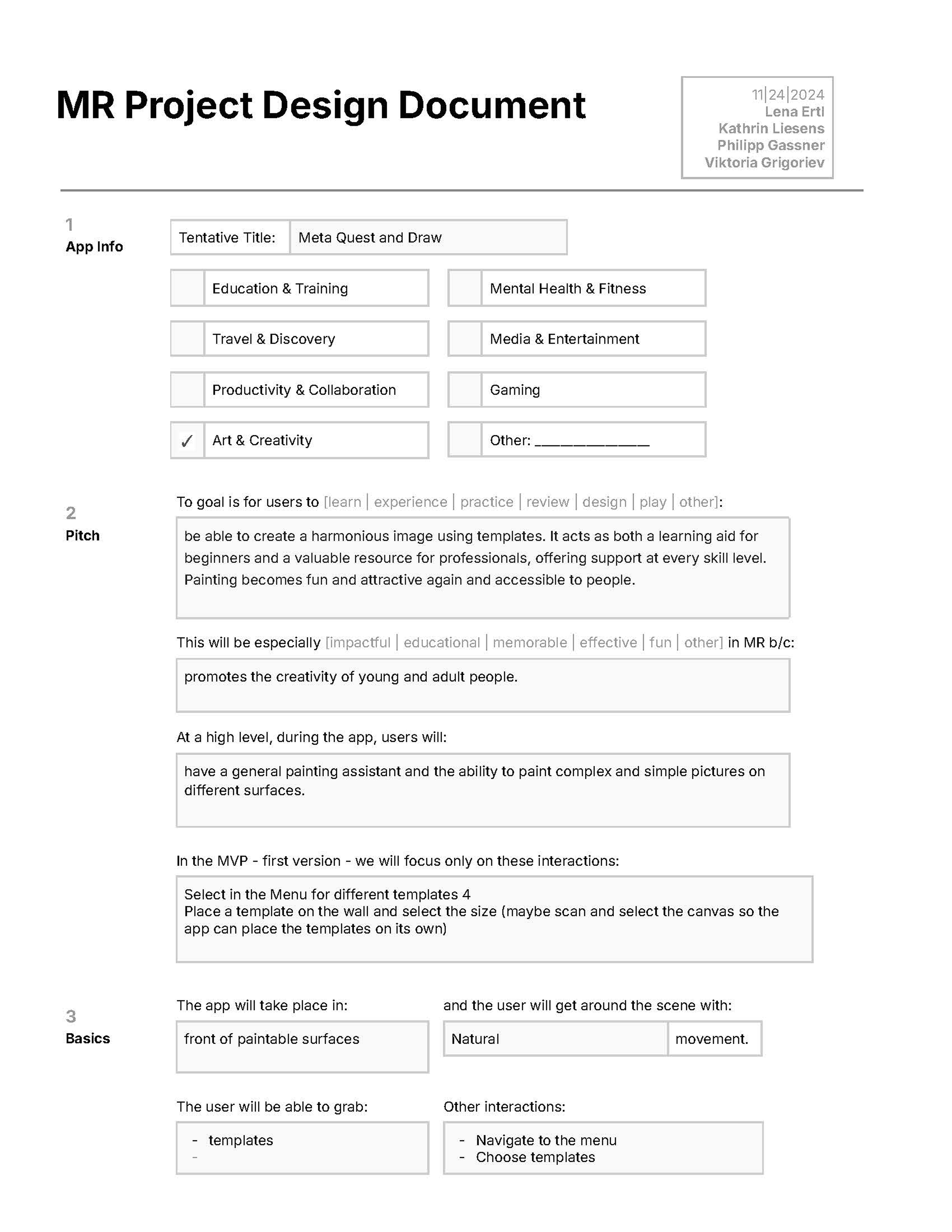 Im frühen Stadium der Entwicklung von MetaQuest & Draw erstellte das Team ein Project Design Document (PDD), um die Idee zu strukturieren, Zielgruppen zu definieren und Kernfunktionen festzuhalten. Dieses Dokument diente als gemeinsame Grundlage für Konzept, Interaktionsdesign und technische Umsetzung in Unity für die Meta Quest 3. Das PDD fasst alle wesentlichen Designentscheidungen zusammen – von der Zielsetzung bis zu konkreten Nutzerinteraktionen. Das Dokument gliederte sich in mehrere Abschnitte: App Info & Pitch: Definition des Projektnamens, Themenbereichs (Art & Creativity) und Zielsetzung. Basics: Beschreibung des Nutzungskontexts – das Malen vor physischen Flächen mit natürlicher Bewegung in der realen Umgebung. Events & Interactions: Planung zentraler Interaktionen wie das Platzieren, Verschieben und Entfernen von Vorlagen sowie haptische und auditive Feedbacks beim Zeichnen. UI & Menüs: Skizzierung eines intuitiven Interface-Konzepts mit einem zentralen Menü („Burger Menu“), über das Vorlagen und Rastergrößen ausgewählt oder Transparenzen angepasst werden können. Timeline: Definition erster Meilensteine für den Prototypen, einschließlich Menüstruktur, dynamischer Rastergröße und Zeichenmodus. Durch das Ausfüllen des Project Design Documents konnte das Team den Funktionsumfang klar priorisieren und ein gemeinsames Verständnis über den User Flow, Interaktionslogik und technische Anforderungen entwickeln. Es diente als entscheidender Schritt, um Ideen aus der Konzeptphase in eine umsetzbare technische Planung zu überführen.
