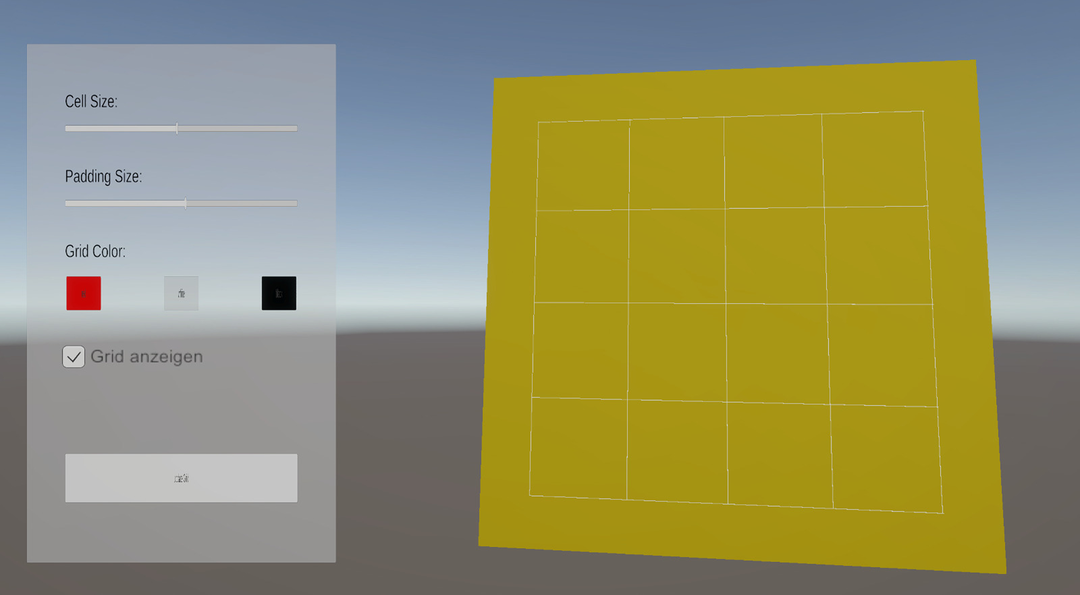 Zu Beginn wurde das Grid-System mit grundlegenden Funktionen umgesetzt. Die Steuerung erfolgte zunächst über Skripte direkt in Unity, da noch keine Benutzeroberfläche integriert war. Anpassungen wie Zellengröße, Abstände (Padding) und Farbe konnten in diesem Stadium ausschließlich im Editor vorgenommen werden. Das Grid wurde erfolgreich auf einer Plane visualisiert, was die technische Basis für die spätere Integration in die Anwendung bildete.