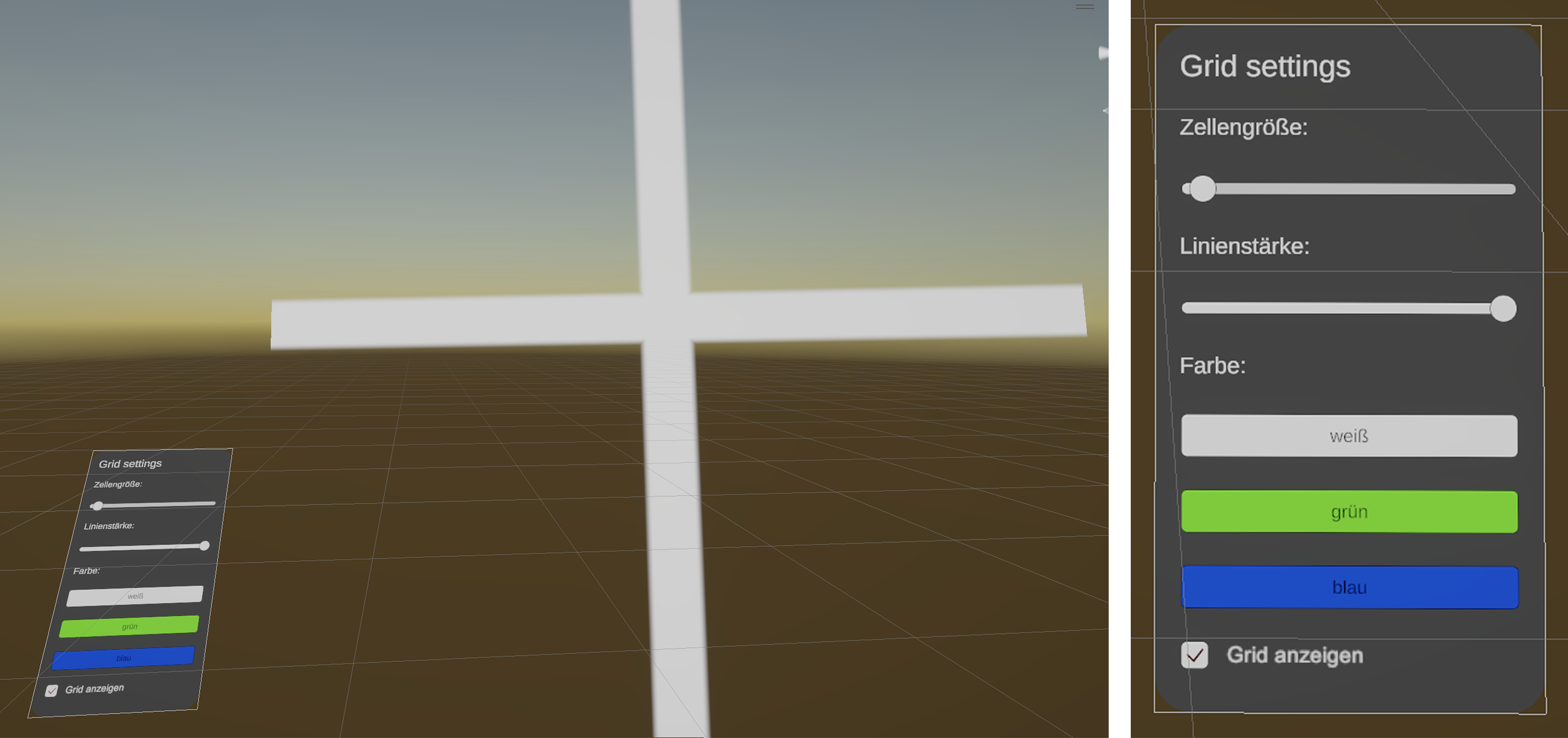 Im nächsten Schritt entwickelte ich eine erste Benutzeroberfläche, um die Grid-Parameter dynamisch anzupassen. So konnten Zellgröße und Abstände über Regler verändert werden. Da zu diesem Zeitpunkt noch keine Verbindung zur Meta Quest 3 bestand, erfolgten alle Tests im Game-Modus von Unity. Eine direkte Interaktion über die VR-Controller war noch nicht möglich. Anschließend wurde das Interface um zusätzliche Optionen erweitert: Nutzer:innen konnten nun die Farbe des Grids ändern sowie das Raster ein- oder ausblenden. Dies erleichtert die Anpassung an unterschiedliche Hintergründe und verbessert die Lesbarkeit. Mangels funktionierender Verbindung zur Brille erfolgte das Testen weiterhin im Editor.